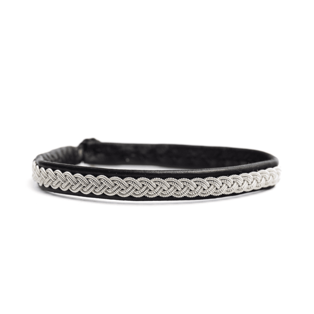 Un bracelet classique en étain au design intemporel. Fabriqué artisanalement à partir de cuir de renne tanné naturellement et de fil d'étain tressé, il se patine avec le temps et devient encore plus beau. Le bouton est en bois de renne, et le bracelet est doux et souple.